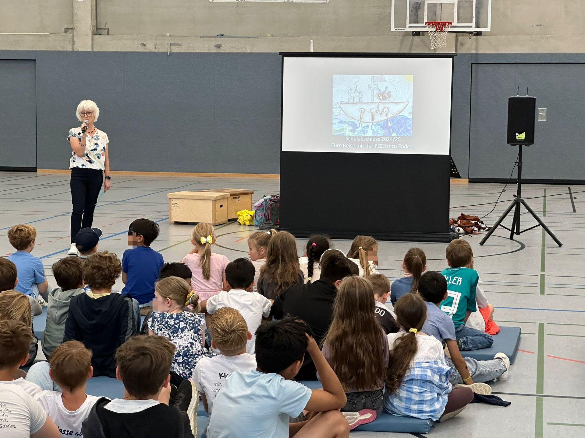 Unsere Schulleiterin, Frau Braun, verglich die Schule mit einem Schiff, das immer wieder neue Inseln ansteuert, und die eine oder andere Herausforderung bereithält. Frau Braun wünschte den Mädchen und Jungen viel Erfolg, Mut und Zuversicht für ihren weiteren Lebensweg. Das Schulschiff PGS verlässt ebenfalls unser beliebter Konrektor, Herr Meyer, der nach Hamburg zieht. Ihm dankte die gesamte Schulgemeinde für sein Engagement und wünschte ihm für Hamburg viel Erfolg. Wir werden Herrn Meyer vermissen und mit ihm den „Dackel Waldemar“ (Bewegungslied), der stets ein gern gesehener Gast bei Einschulungsfeiern war. Alles Gute, lieber Herr Meyer und ahoi!