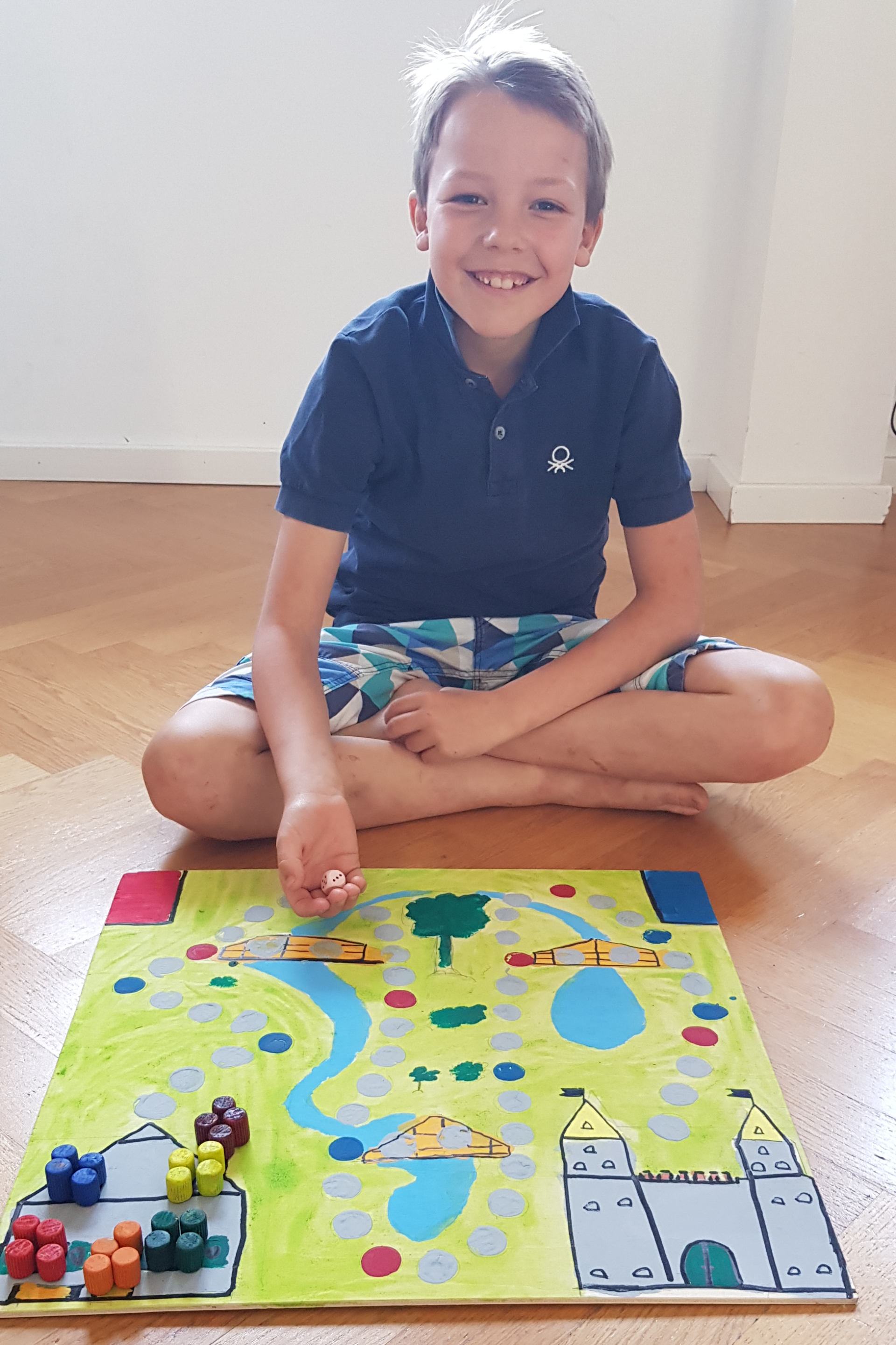 Ich brauchte ein Brett, Farben, Figuren, einen Würfel und einen Korken.