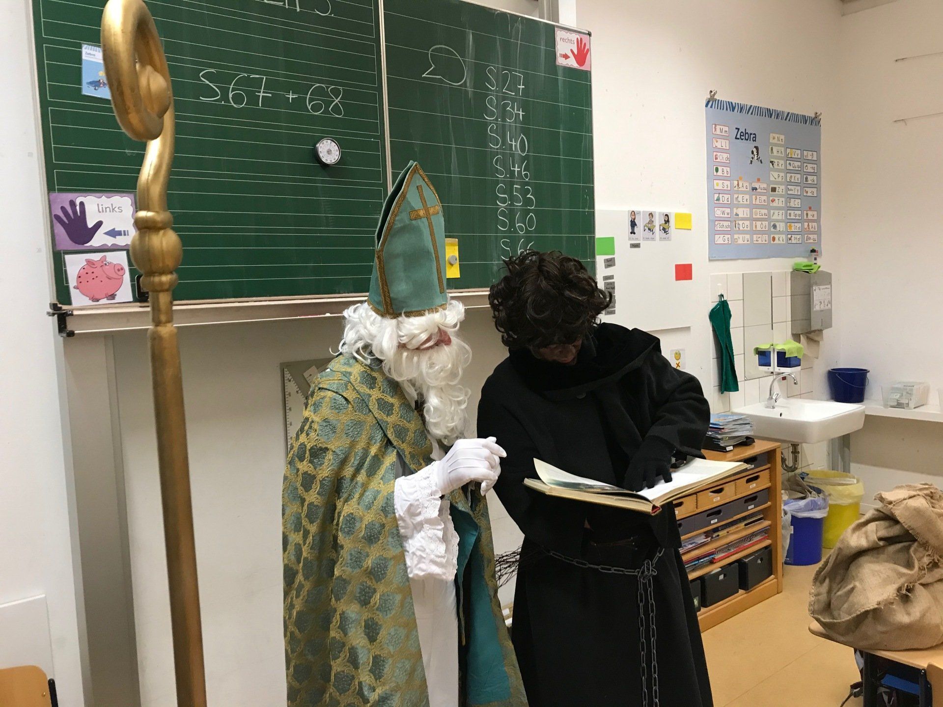 Einige Zeit später klopfte es dann doch plötzlich an der Tür und das Staunen war groß als der Nikolaus und Knecht Ruprecht eintraten. Tolle Eigenschaften von den Kindern und Leistungen der Klassen wurden aus dem goldenen Buch verlesen. Der Klassenraum war von Stolz und Glück erfüllt. Die Kinder haben den Nikolaus mit einem Lied oder Gedicht beeindruckt und wurden anschließend mit einer kleinen süßen Leckerei und einer Mandarine belohnt.