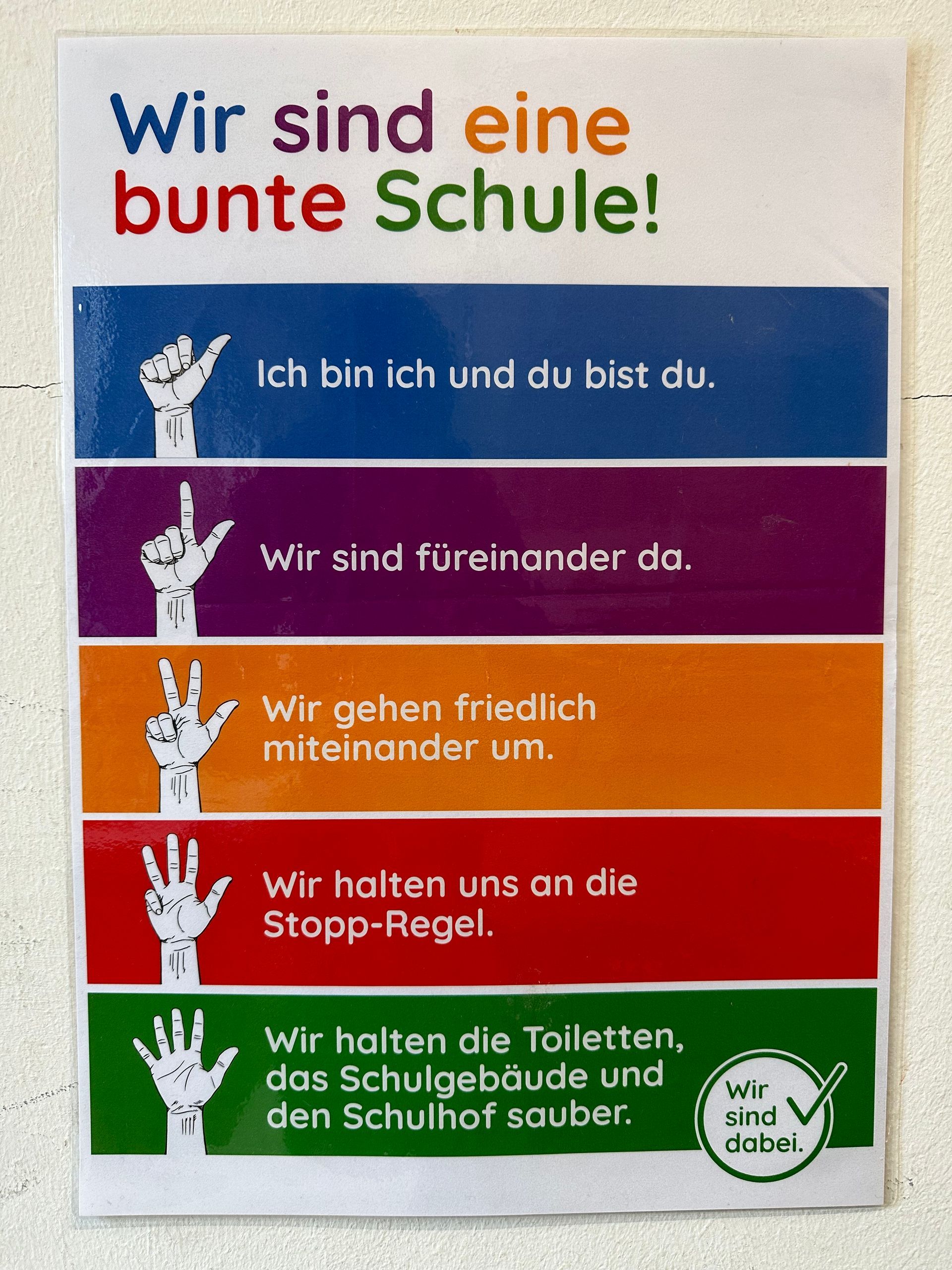 Regelmäßig tauschen wir uns im Klassenrat und Schüler*innenparlament darüber aus und erinnern uns, wenn es nötig ist, an die Einhaltung.