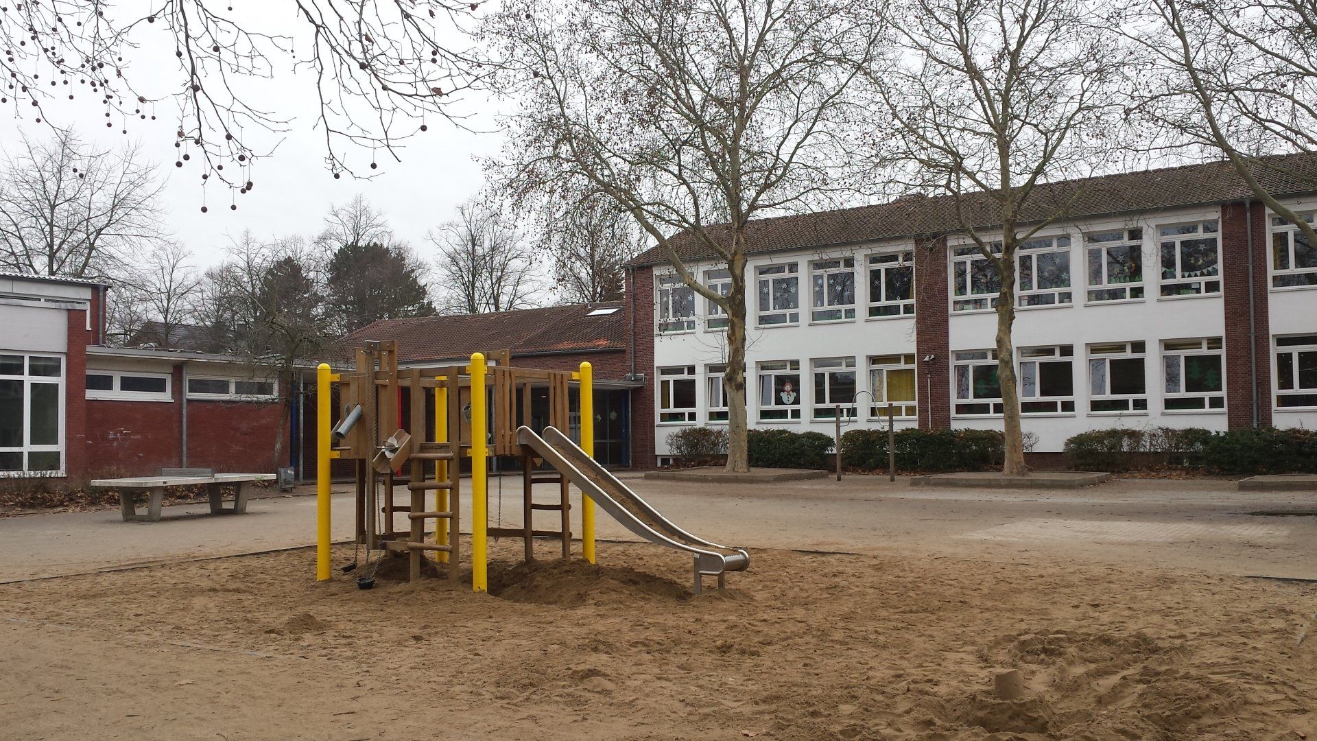 Für Spiel, Sport und Bewegung gibt es zwei Turnhallen, ein Gymnastikraum, einen großen Schulhof mit attraktiven Spielgeräten sowie einen großen Fußballplatz mit angrenzender Laufbahn und Sprunggrube.